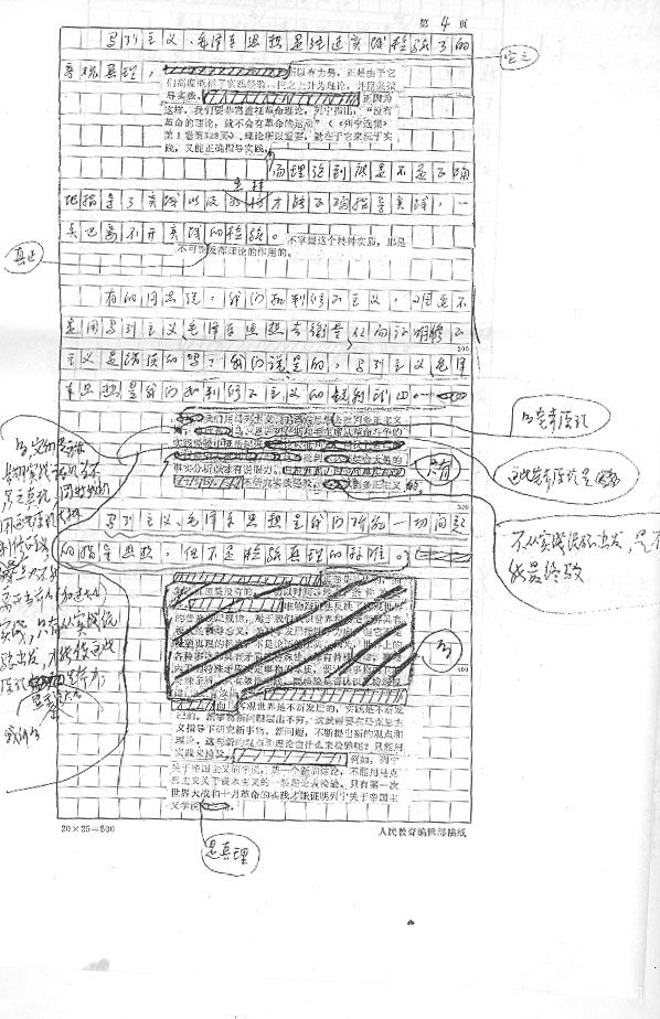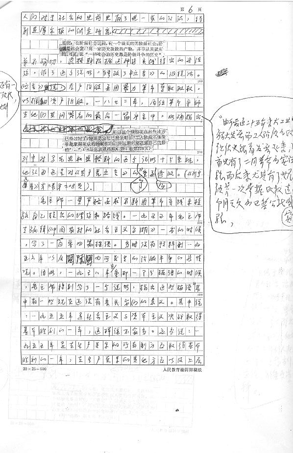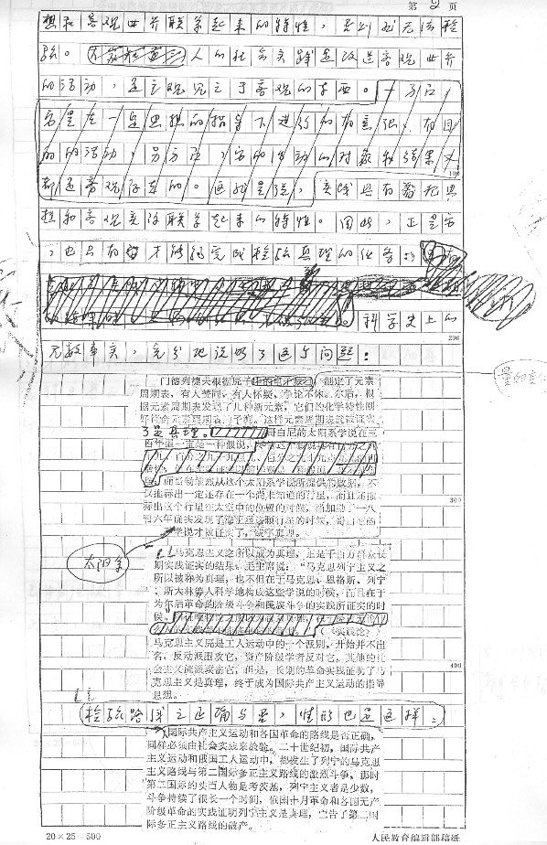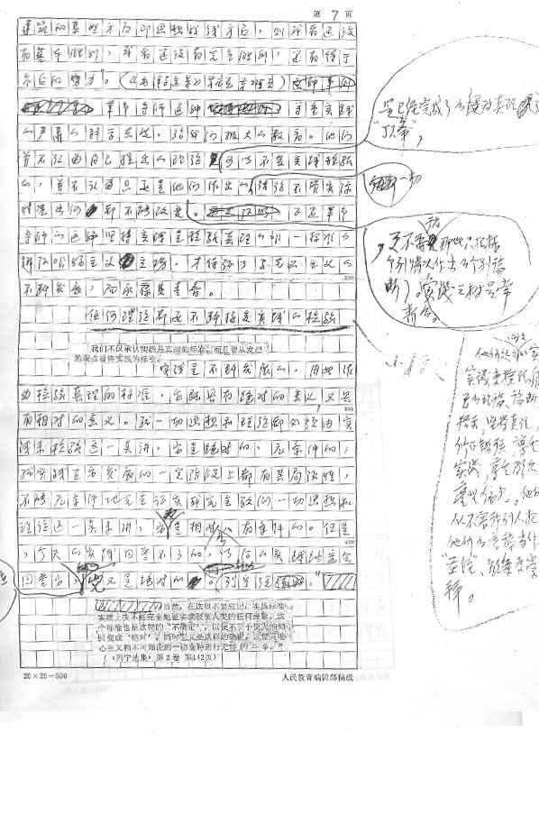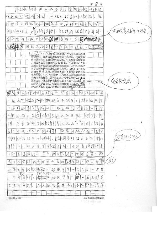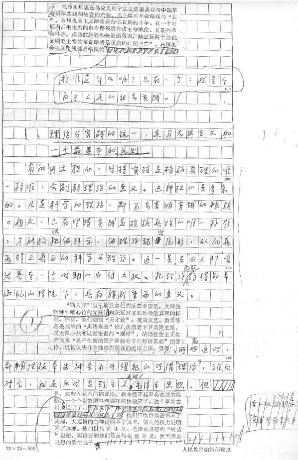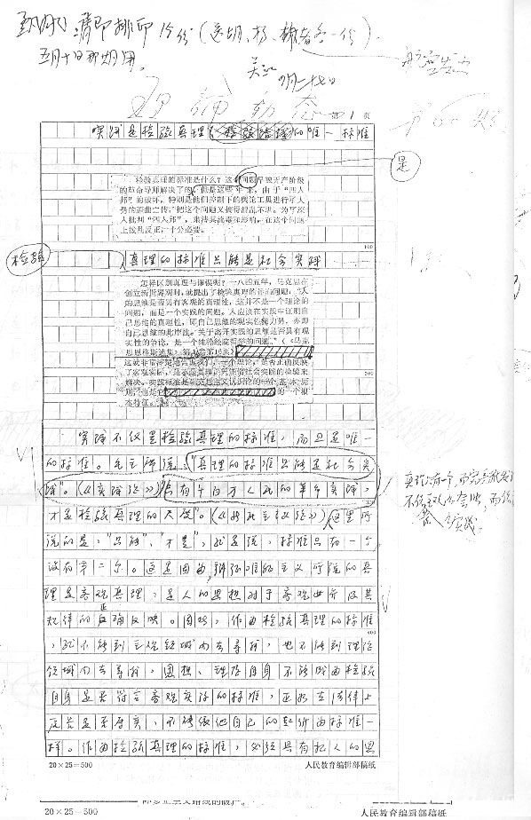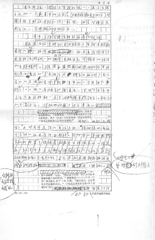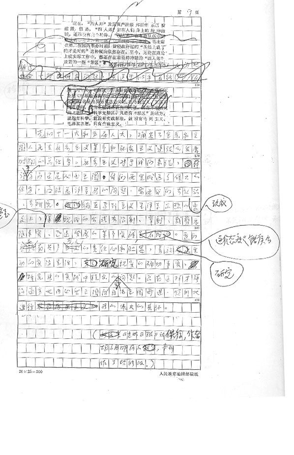 (编辑注:图中剪贴小字为光明日报的修改稿,稿纸格内手写体为孙长江作,文旁另加部分为吴江添加。)