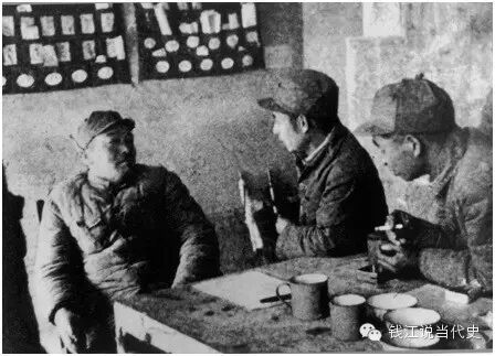 1949年4月,彭德怀(左1)和胡耀邦(中)在太原前线指挥部。