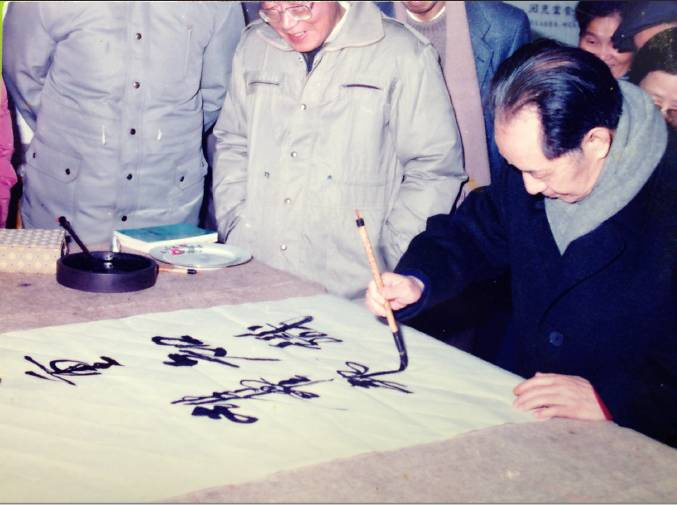 此次回湘,喜欢书法的耀邦同志曾多次谢绝了各地请他题词的请求。此时,面对早已摆好的笔墨,他知道难以推托,风趣地笑道:“要我题词,一字千金哩!”又指着摊开的大张宣纸说,“这纸太大,容我回去写好送来行不行?”众人不允,耀邦同志只好提笔。