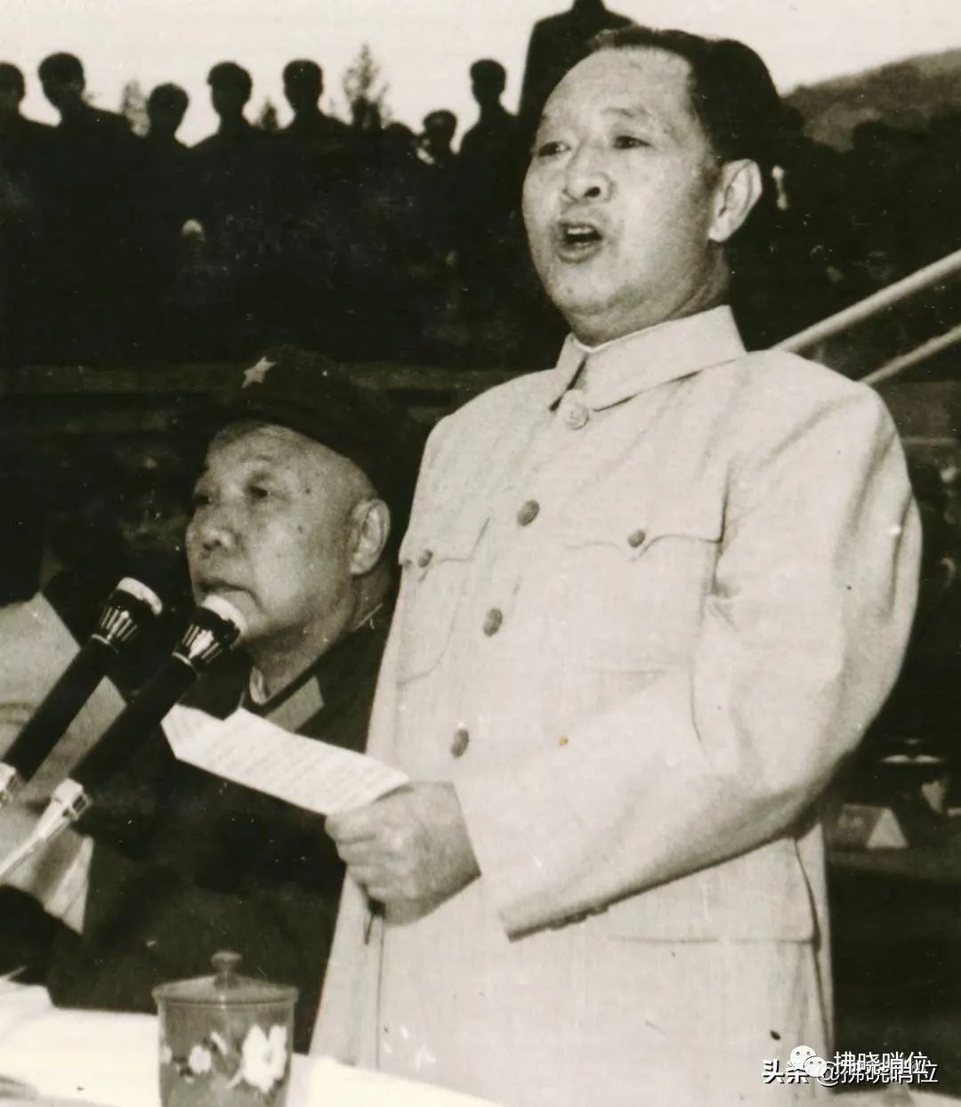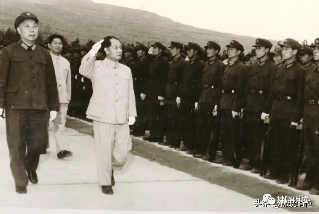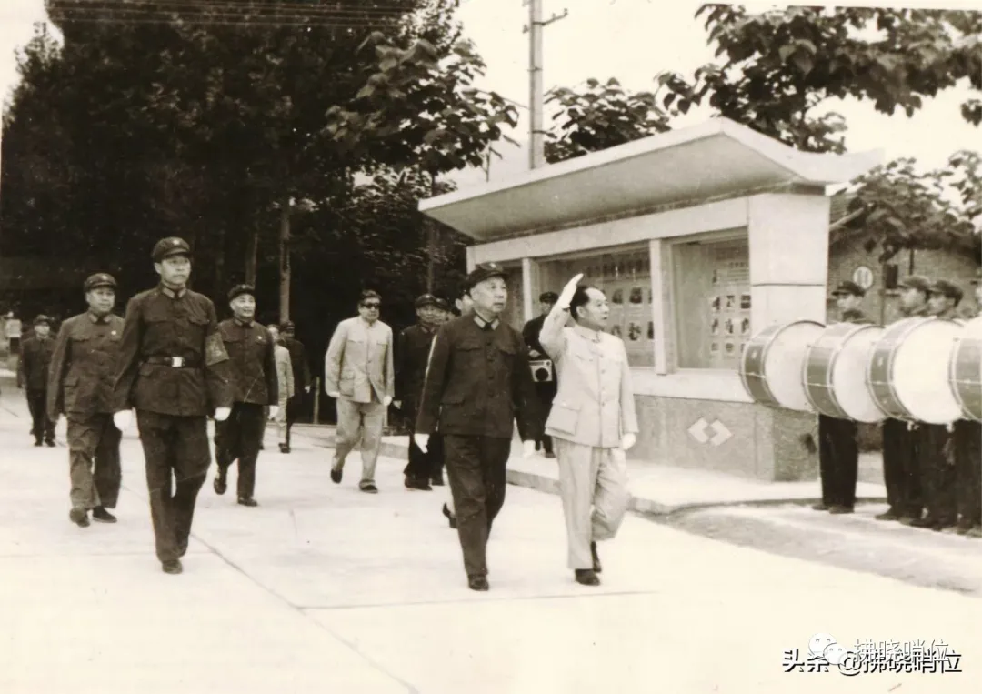 胡耀邦总书记在兰州军区政委肖华(左)甘肃省委书记李子奇(后)等军地领导陪同下阅兵
