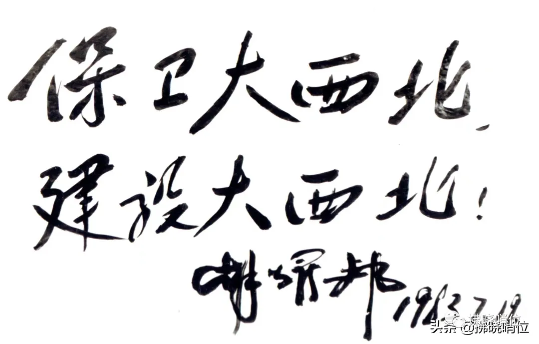胡总书记在团里来,关于题词,当时团里安排了三个点,一个是团史馆,一个是九连,一个是五连。团里给这三个地方都提前准备了笔墨纸砚。胡总书记在团庆50周年演讲以后,就直奔九连,在那里题写了“发扬金刚钻精神,为四化立新功!”的题词,从九连出来以后,经过团大操场,来到了五连,在这里题写了“保卫大西北,建设大西北!”的题词。