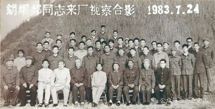 胡耀邦同志在国营二二一厂视察时,与厂领导和职工合影留念。