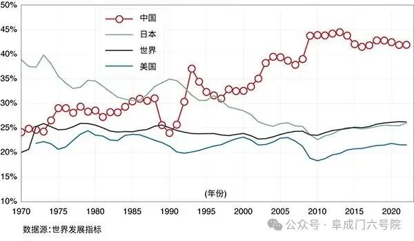 (四)然而,进入九十年代以后,我国的经济增长重回依赖投资的的路径。以固定资产投资占GDP的比例为例,1990年为25.9%,2024年则为38.1%,我国去年固定资产投资总额达到了51.3万亿(7.21万亿美元),固定资本形成总额大致相当于G7国家之和。重商主义逻辑下的出口则是另一个依赖,中国出口的全球占比从1.9%上升到14.7%,贸易顺差从87亿美元增加到9921亿美元,增加了100倍还多。