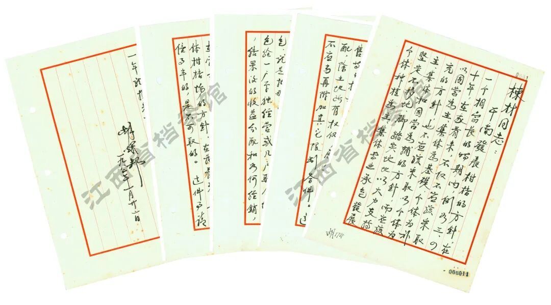 这份档案是江西省档案馆珍藏的一封信件,共5页,由时任中共中央总书记胡耀邦于1982年1月22日写给当时江西省委常务书记、省长白栋材,主要内容是关于赣南发展柑橘生产的方针。