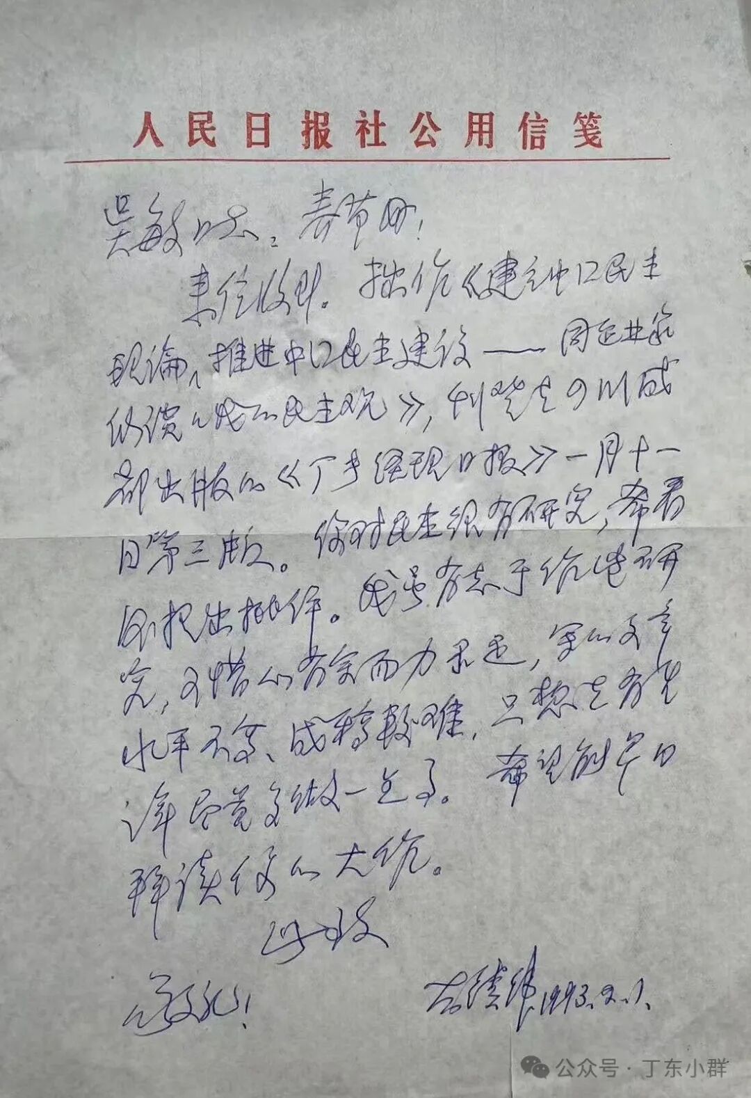 整理书柜,看到胡绩伟先生1993年2月1日给我的一封信。信里谈到:“拙作《建立中国民主理论,推进中国民主建设——同企业家们谈谈我的民主观》,刊登在四川成都出版的《厂长经理日报》一月十一日第三版。你对民主很有研究,希看后提出批评。我虽有志于作些研究,可惜心有余而力不足,写的文章水平不高,成稿较难,只想在有生之年尽量多做一点事。希望能早日拜读你的大作。”
