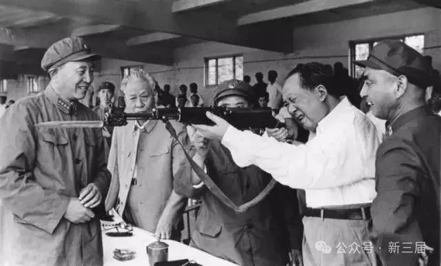 1964年,毛泽东亲临“大比武”会场,这是他唯一一张拿着枪的照片,说明还是很重视“大比武”的。左一是“大比武”的领军人物总参谋长罗瑞卿