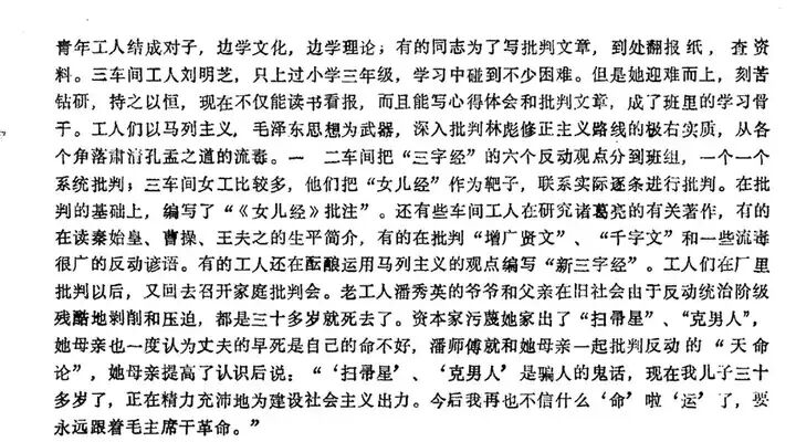 丁某的讲话文本是市委秀才们起草的,这是70年代党内最为时兴、日渐圆熟的理论腔调,张春桥、姚文元尤其擅长此类写作,语气空泛而生硬,来回名词“拉锯”,只是满足官方的一时急需,缺乏扎实的学理。影响所及,北京工人理论队伍所写的文章也大都呈现此类空洞文风,由于涉及艰深问题,理解不便,行文更为晦涩、突兀,论及历史性、理论性较强的话题更要装腔作势,摆出“非我莫赢、你错我纠”的斗争姿态。