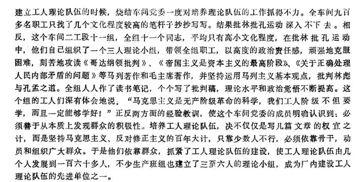 北京汽车修理公司五厂是一个只有职工829人的小厂,1973年4月就建立起117人的理论队伍,组建了13个研究小组,其中党史组准备用一年时间,立志写一本大部头的中共党史。厂党委王副书记在1975年8月6日市理论工作座谈会上,极为高调地表态:“这是时代赋予我们工人阶级的伟大历史使命。要实现这样广泛深刻的革命,只靠研究机关和少数专业人员是不行的,必须放手发动群众,走群众路线。我们要想全局,有远见。不怕厂子小,就怕志气短。”
