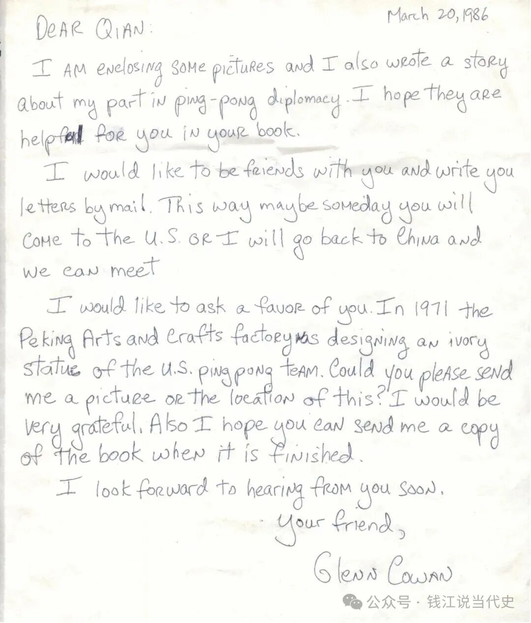 我在信中附上几张照片,也写了一段关于我在“乒乓外交”中的故事,希望对你的著作有所帮助。