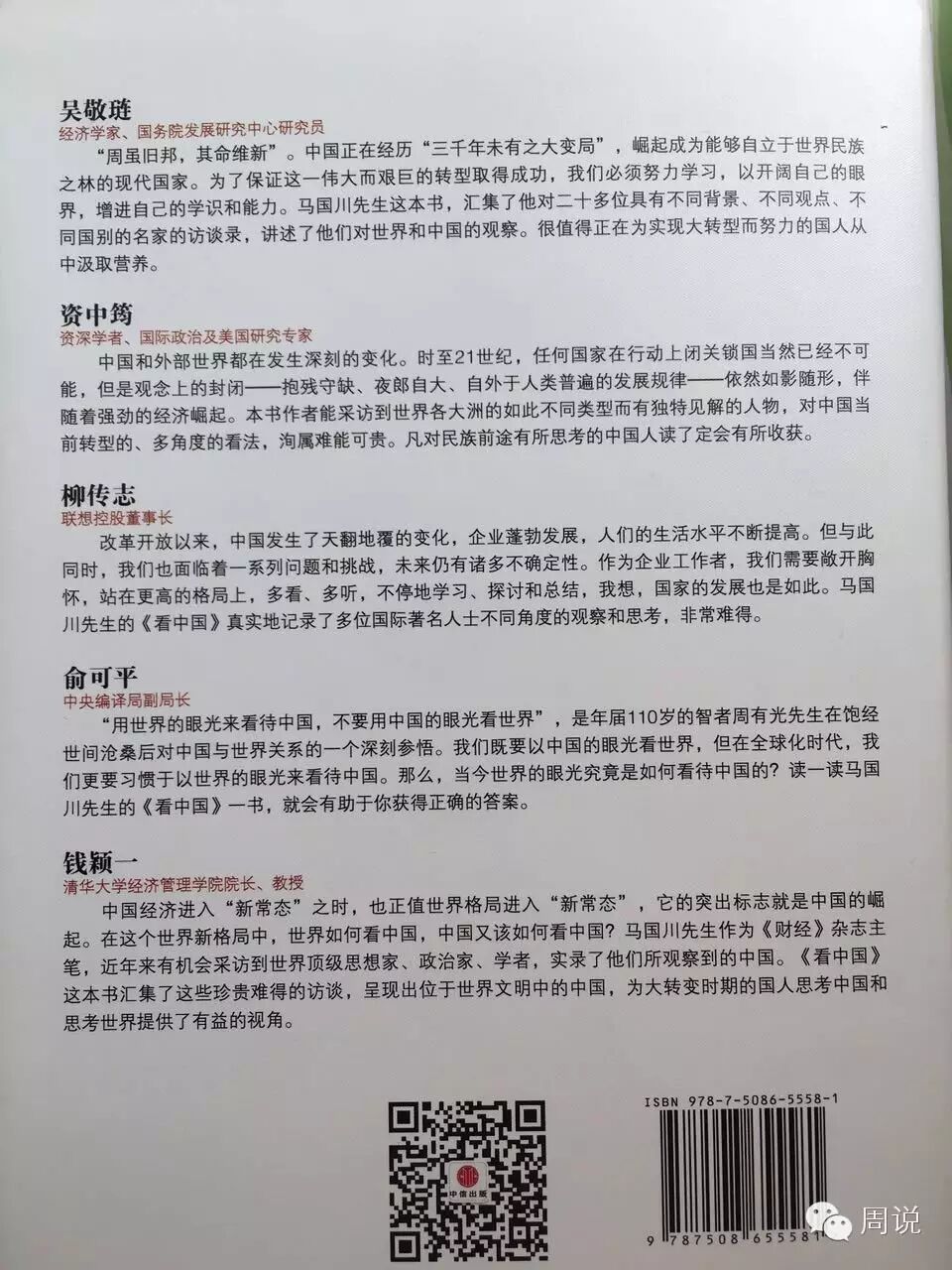 "我的乡贤、111岁的周有光先生曾经多次说过,不要从中国看世界,要从世界看中国。马国川先生的《看中国》,正是站在世界的角度看中国。说起来容易,其实很难,因为世界上看中国的角度有多种多样,选择哪些人的观点,如何看待这些观点,能不能从赞扬中看到不足,能不能把批评的声音传递进来,这些,都是不容易做到的。不解决这个问题,看中国也容易看偏。马国川先生选择的都是世界级的大师,他们的看法,具有典型的意义。"