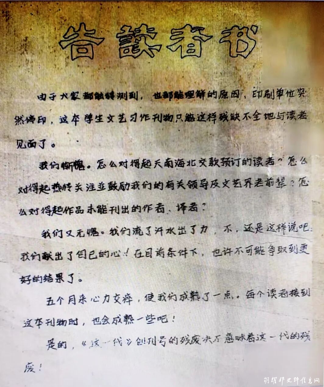 由于大家都能猜测到,也都能理解的原因,印刷单位突然停印,这本学生文艺习作刊物只能这样残缺不全地与读者见面了。