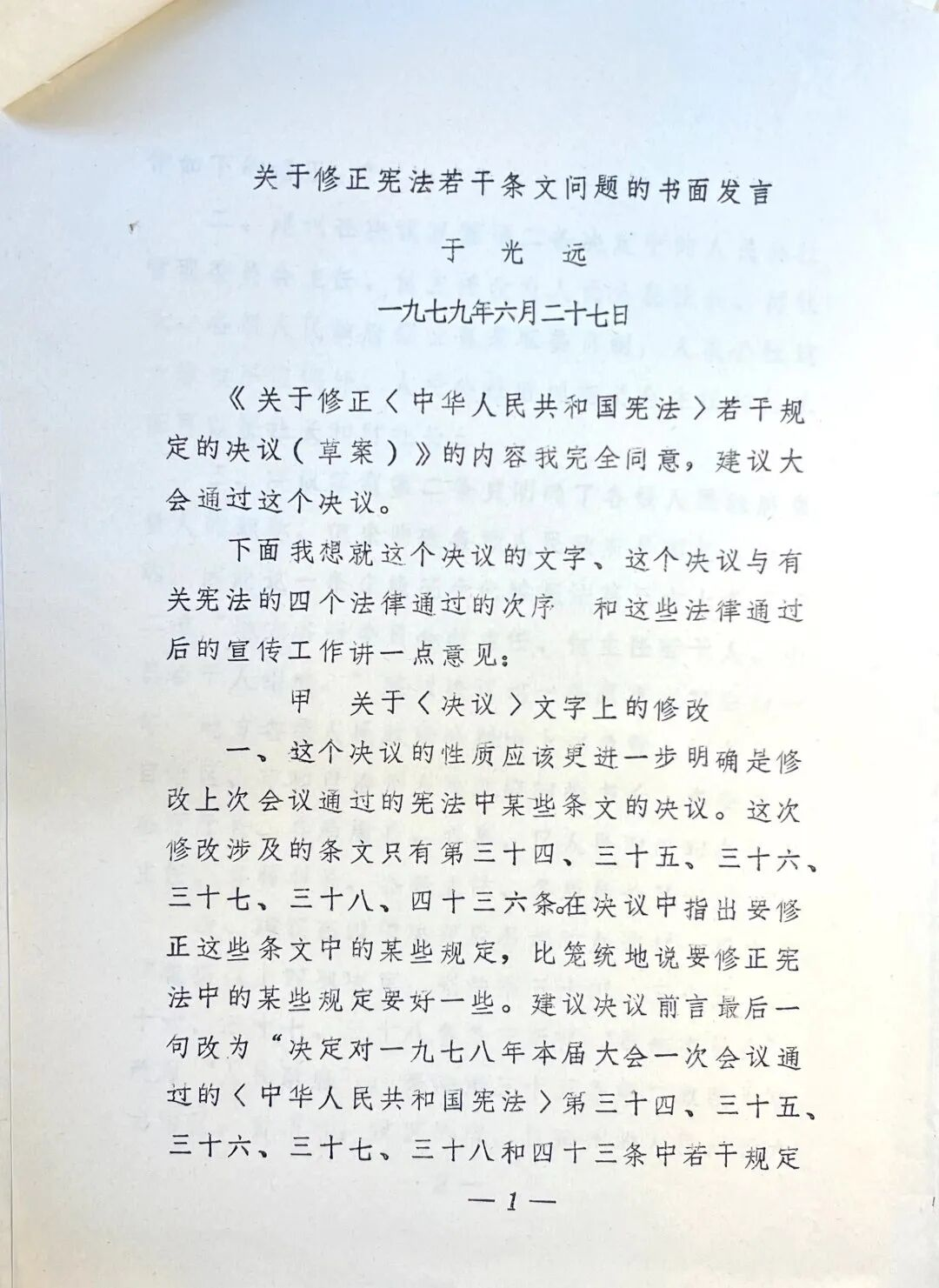 日前读到左亦鲁老师新作“中国宪法‘第一修正案’——1979年修宪决议的历史背景与宪法功能”(简称“左文”),文中将1979年五届全国人大二次会议所通过之《关于修正宪法若干规定的决议》(简称《1979年修宪决议》)视作中国宪法的“第一修正案”,殊有新意。左文提出,从最初的“只作决议不修宪”到最终决议修宪的过程中,经历了三个关键时间节点,其中又尤以五届全国人大二次会议上的于光远上书为要。在一定程度上,正是因为于光远的上书,大会主席团才最终决定将“只作决议不修宪”改为“通过决议修改宪法部分条文的形式”,由此才有了中国宪法“第一修正案”的诞生。但可惜的是,作为新中国宪法史上的重要文件,于光远这份上书的内容迄今未见任何相关文献披露。而笔者年前曾偶得于光远先生旧藏资料一批,其中恰有这份上书,遂草成此小文,一则对左文做一些史料上的补充,二则也为未来的新中国宪法史研究提供一些参考。