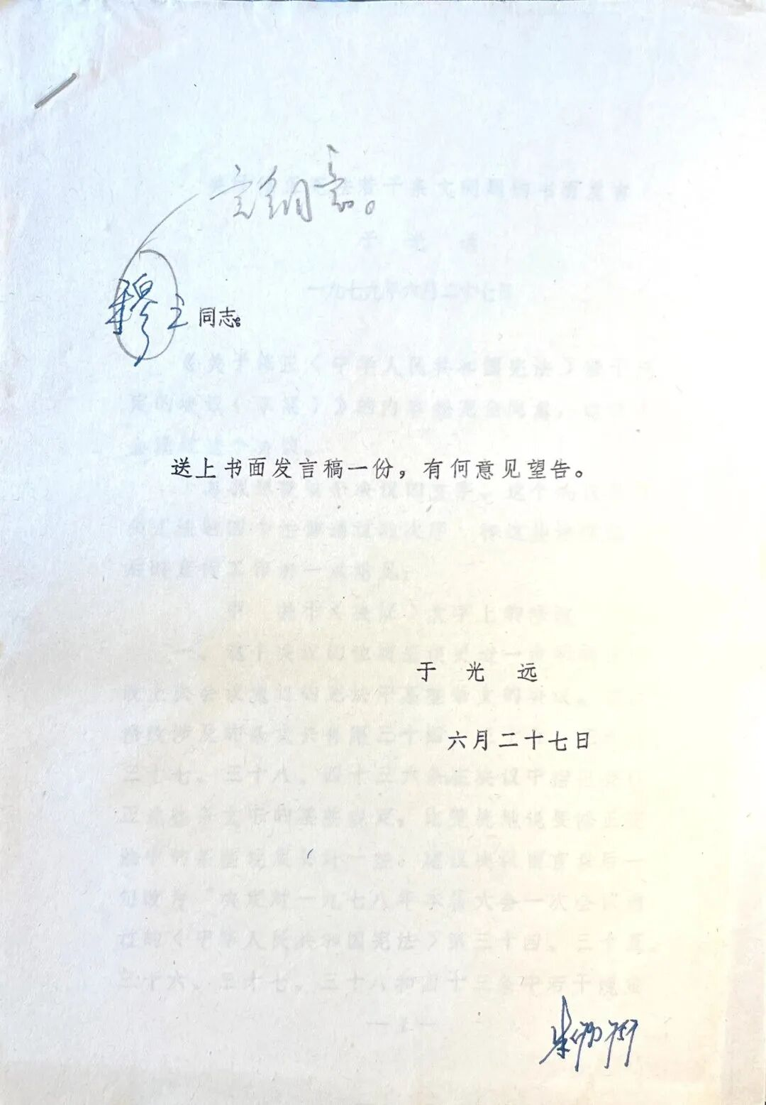 依照王汉斌的回忆,于光远的这封上书是分别寄给胡乔木和王汉斌二人的。但从笔者所藏这份题为《关于修正宪法若干条文问题的书面发言》(1979年6月27日)的资料来看,收到于光远信的人当不止于此。如笔者所藏这份的收件人即为时任中共中央宣传部副部长朱穆之,且封面有朱所批“完全同意”字样;而市面亦曾见时任外交部部长黄华批阅的同一封信件,批语中有“6月28日”的明确时间落款。由此可见,于光远的这份书面发言应是在6月27日当天寄给相当一批党内高级干部的。而从朱穆之与黄华的彼时任职来看,似又与修正宪法并无直接联系,故此份发言稿的具体传阅范围,或还有待未来研究者进一步考察。