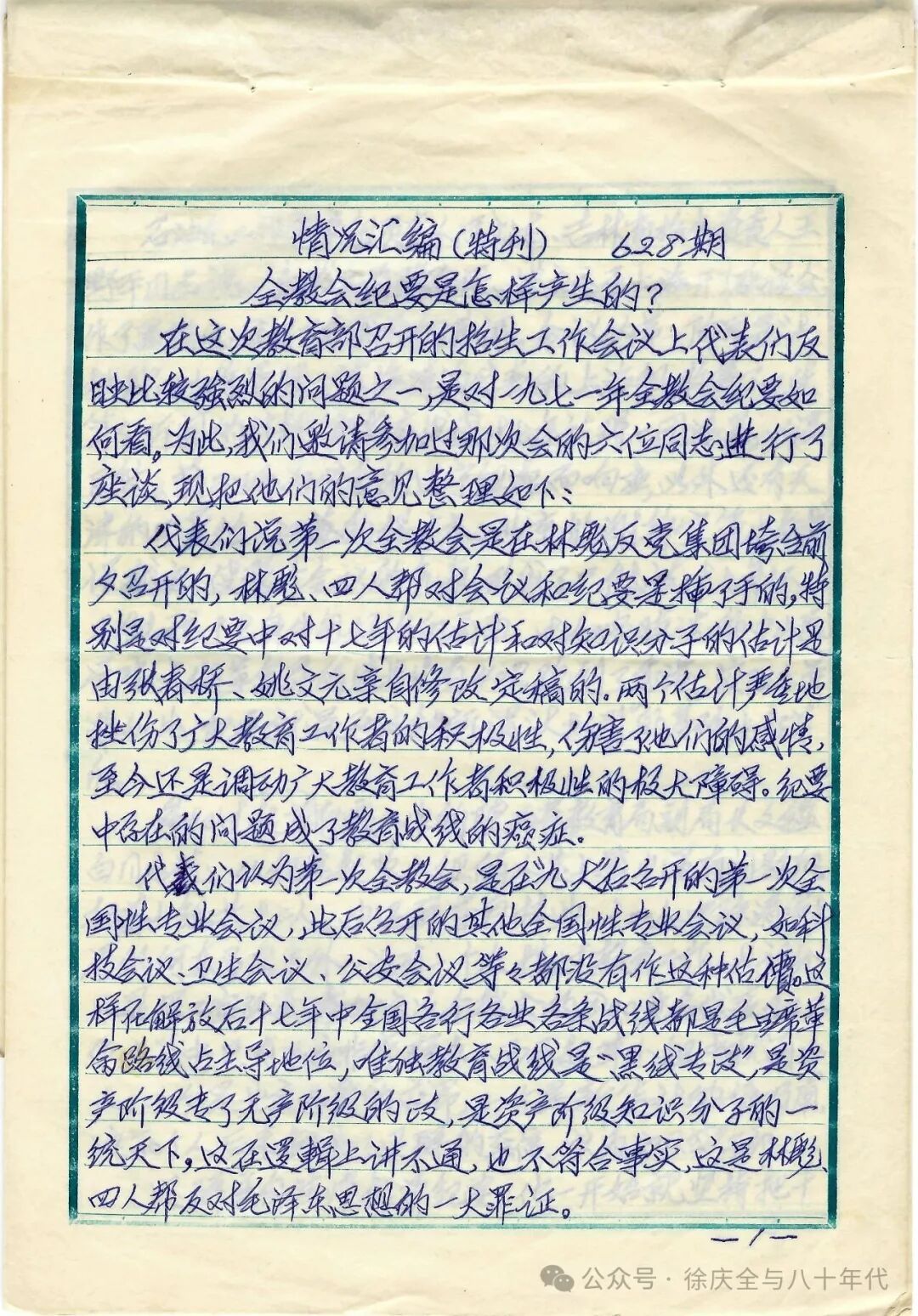 还要提一句,“黑线专政”见之于文艺座谈会那个《纪要》,被全教会《纪要》借用。对这个词的平反,则反过来了,教育的《纪要》中“两个估计”被批判后,文艺界才闻风而动,开始批判、否定文艺《纪要》。