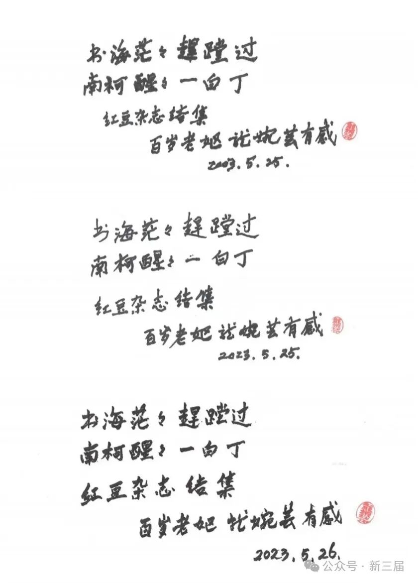 中文系百岁老人龙婉芸先生,本来已为《红豆》结集题词拟好章句——“书海茫茫徜徉过,南柯醒醒一白丁”。但她书写罢“书海茫茫徜徉过”,又觉得不妥,说是图书馆、资料室里那么多的藏书,自己当年又那么忙,怎么可能都阅读过呢?思考再三,把“书海茫茫徜徉过”改为“书海茫茫赶趟过”——自己只是个匆匆忙忙的书海“赶路人”而已。老人家在去年中大中文系举办的百岁华诞庆典上说,自己不过是“一粒小芝麻”,做的工作似乎是“微不足道”的,如今这位中国第一个语言学系首届毕业生,却又谦称自己是个“白丁”。老人家还说:“不敢‘题词’,不敢‘寄语’,我比中大年长一岁,发点儿‘牢骚’成不成?”——这是“牢骚”吗,当然不是。反正,我当成一番语重心长的叮咛。