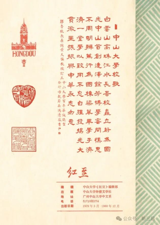 1978年春秋两季,77、78级先后入校,康乐园里春潮鼓荡,中文系学生在老教授楼栖、王起(季思)、吴宏聪先生与黄天骥、金钦俊、刘孟宇、肖德明、裘汉康先生等中壮年老师的支持下,开始酝酿成立文学社团、出版文学刊物,最终确定文学社名为“中山大学钟楼文学社”,并编辑出版文学杂志《红豆》。