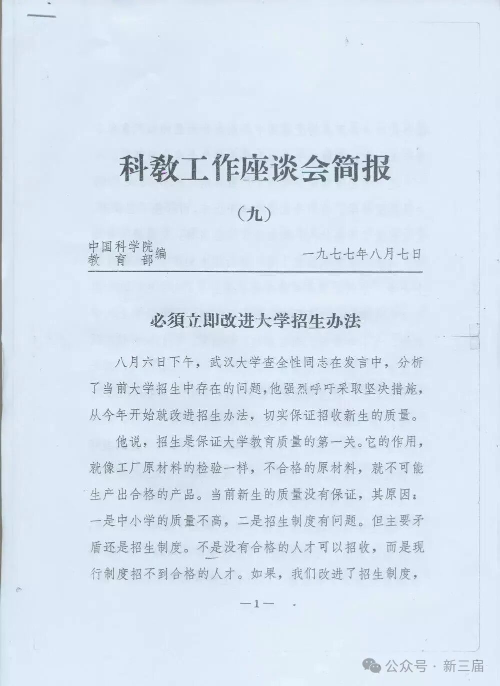1977年8月7日《科教工作座谈会简报(九)〈必须立即改进大学招生办法〉》