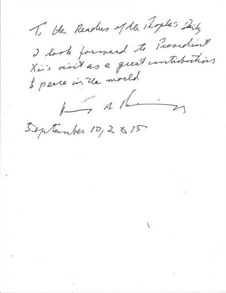 专访结束后,基辛格欣然为人民日报读者题词:“致人民日报读者:我期待着习主席的访问将为世界和平做出重大贡献。亨利.A.基辛格2015年9月10日”。